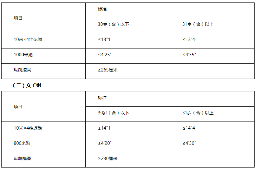 體能測(cè)評(píng)三項(xiàng)全部達(dá)標(biāo)方為合格。體能測(cè)評(píng)項(xiàng)目中,縱跳摸高的測(cè)試次數(shù)不超過(guò)3次,10米×4往返跑的測(cè)試次數(shù)不超過(guò)2次,長(zhǎng)跑項(xiàng)目(男子1000米、女子800米)的測(cè)試次數(shù)為1次。