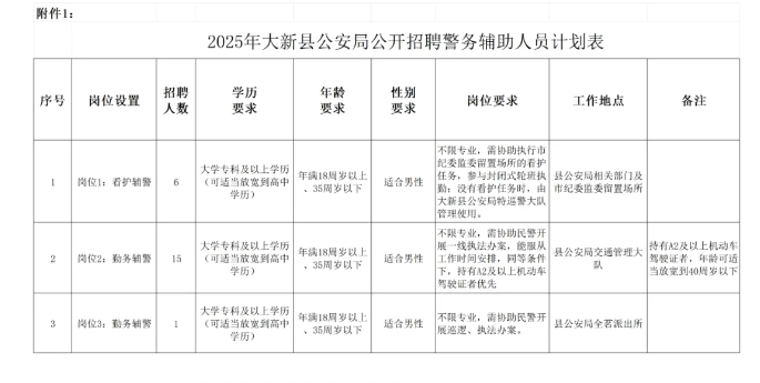 為適應(yīng)當(dāng)前社會(huì)治安形勢(shì)的需要,進(jìn)一步充實(shí)公安機(jī)關(guān)警務(wù)輔助力量,推進(jìn)平安大新建設(shè),有效維護(hù)社會(huì)治安穩(wěn)定,根據(jù)《廣西壯族自治區(qū)公安機(jī)關(guān)警務(wù)輔助人員條例》《崇左市公安機(jī)關(guān)警務(wù)輔助人員管理辦法》《崇左市公安機(jī)關(guān)警務(wù)輔助人員管理招聘管理辦法》(試行)等文件精神,經(jīng)縣人民政府同意,大新縣公安局決定面向社會(huì)公開(kāi)招聘警務(wù)輔助人員22名(以下簡(jiǎn)稱輔警)?,F(xiàn)將有關(guān)事項(xiàng)公告如下: