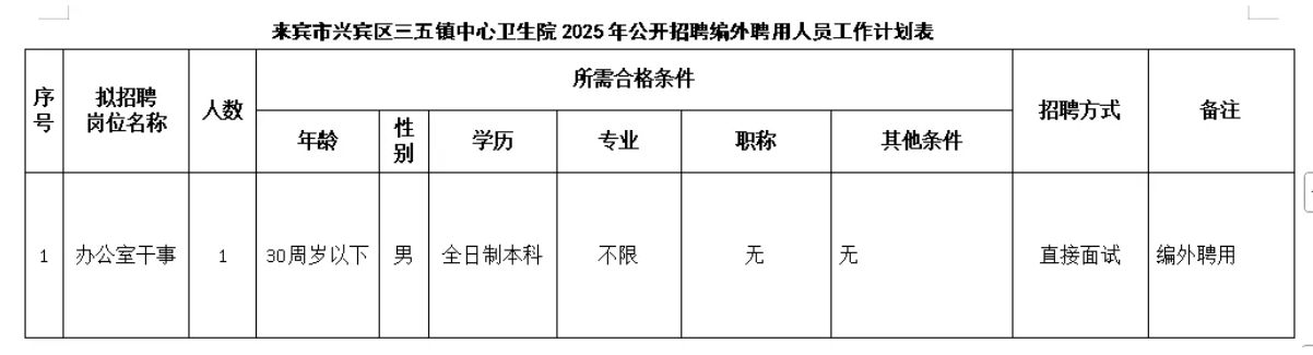 2025年廣西來賓市興賓區(qū)三五鎮(zhèn)中心衛(wèi)生院公開招聘編外工作人員1人