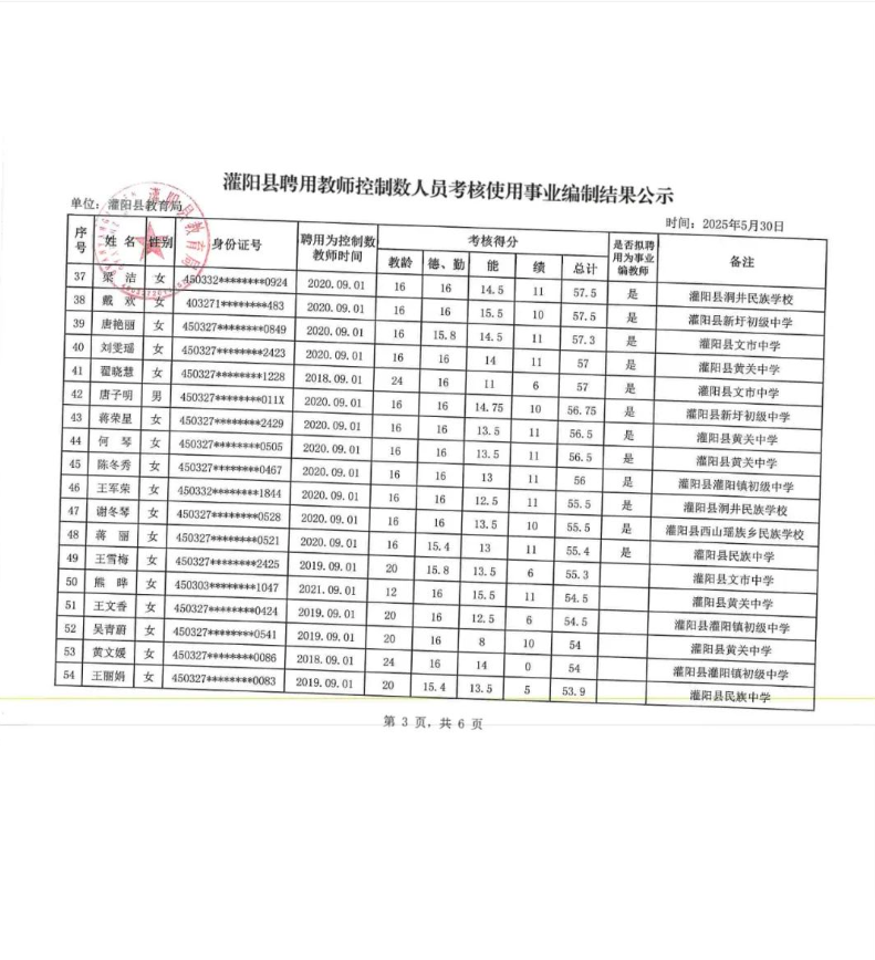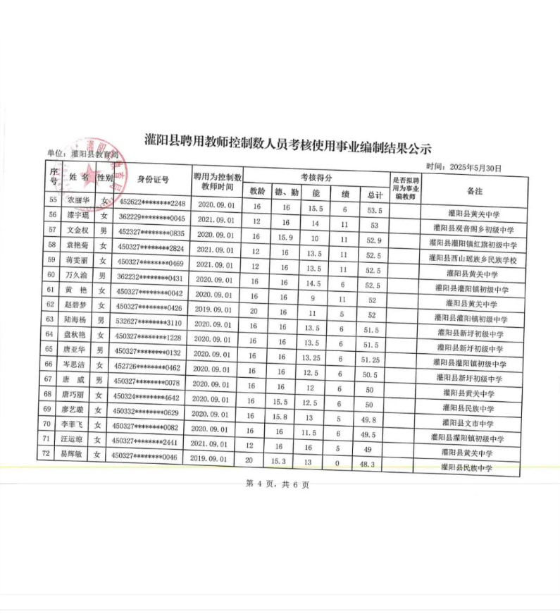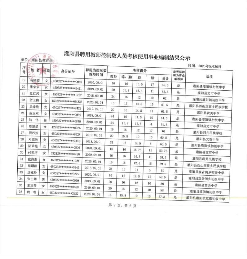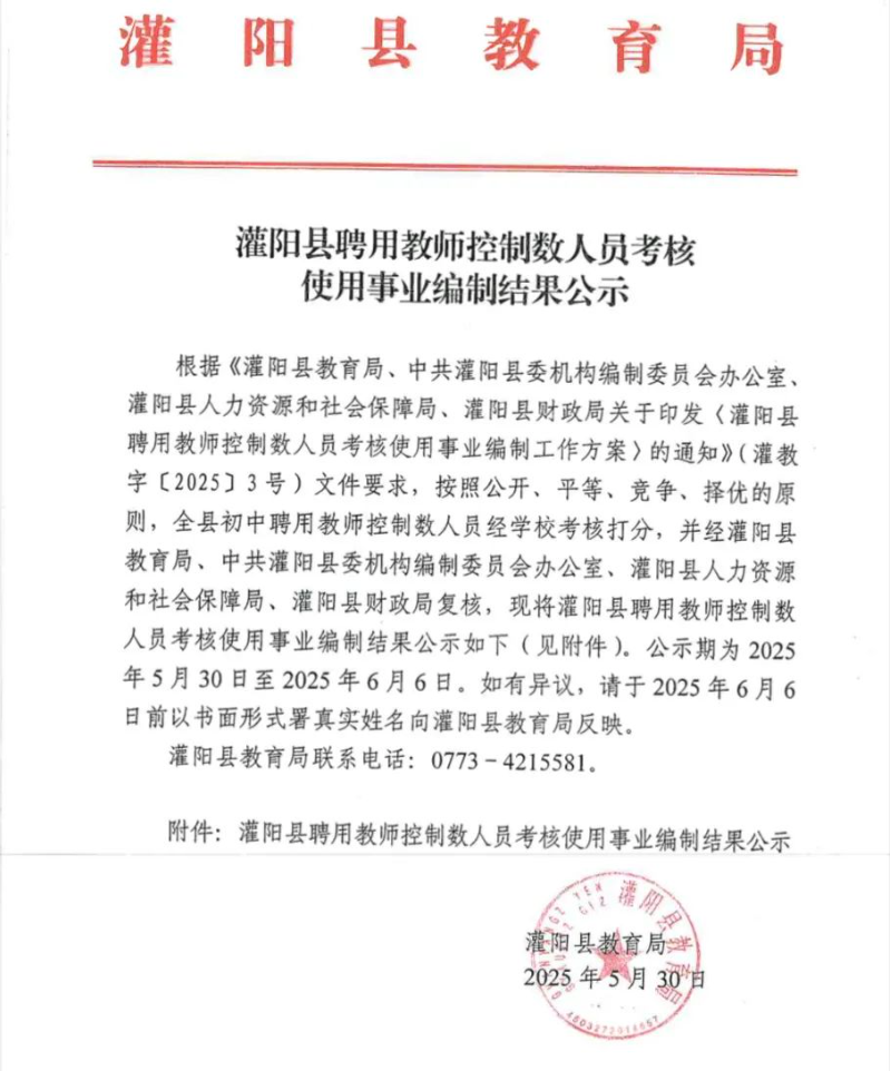 灌陽(yáng)縣聘用教師控制數(shù)人員考核使用事業(yè)編制結(jié)果公示