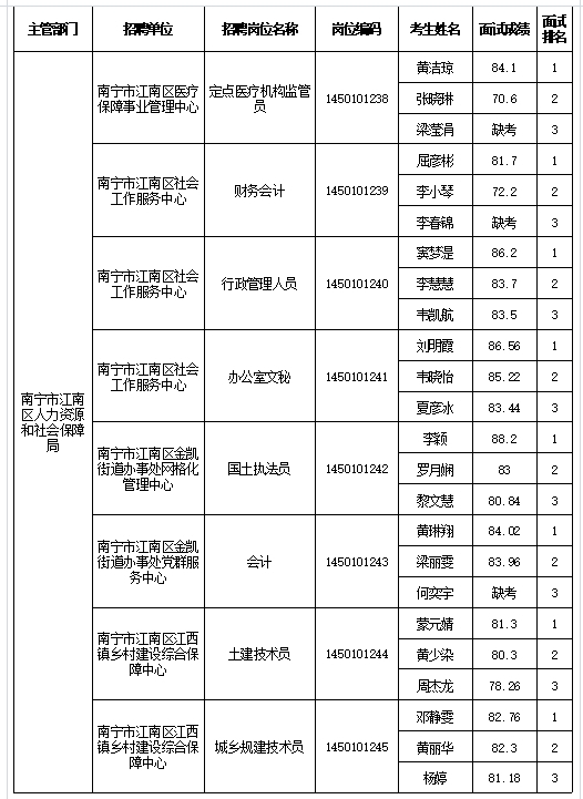 南寧市江南區(qū)人力資源和社會保障局2025年公開考試招聘事業(yè)單位工作人員面試成績表