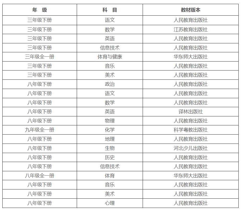 欽北區(qū)2025年春季學(xué)期使用的教材內(nèi)容,小學(xué)三年級、初中八年級(化學(xué)九年級)。教材版本如下:
