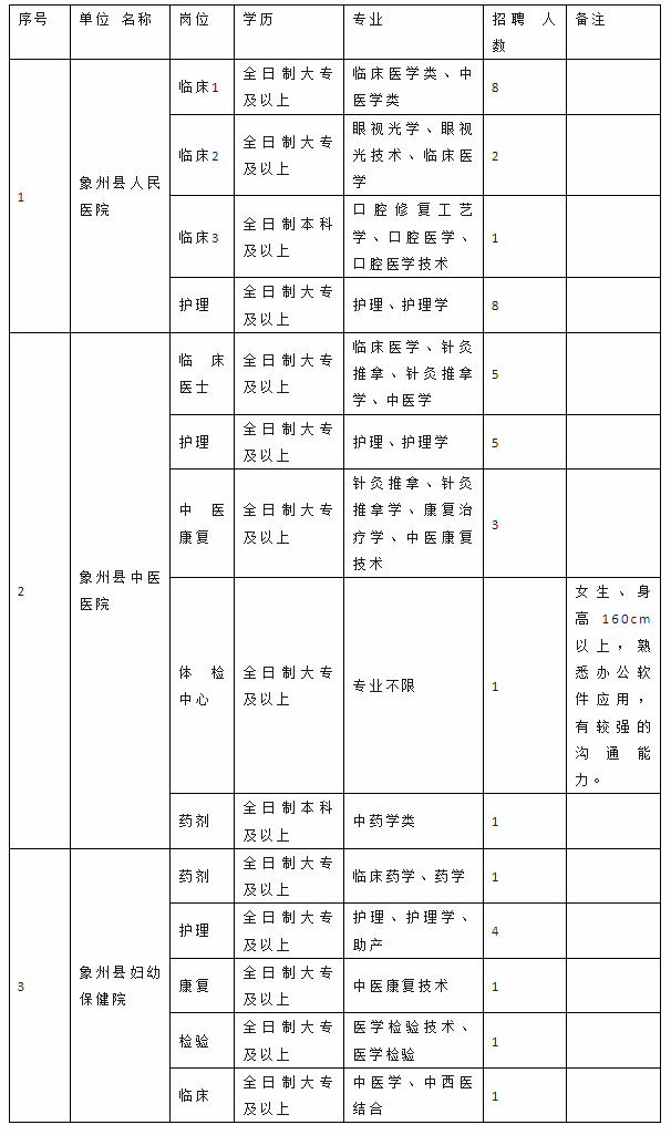 因工作需要,根據(jù)相關(guān)規(guī)定,我單位擬面向社會(huì)公開招聘見習(xí)人員42名,其中象州縣人民醫(yī)院19人、象州縣中醫(yī)醫(yī)院15人、象州縣婦幼保健院8人。現(xiàn)將有關(guān)事項(xiàng)通知如下: