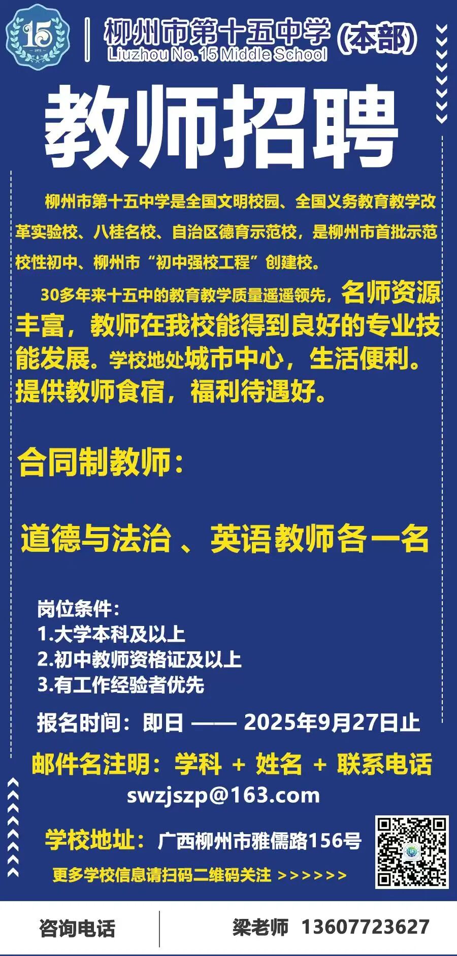 2025年柳州市第十五中學(xué)本部招聘公告