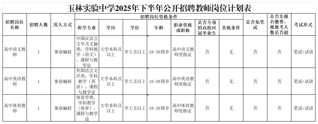 具體招聘信息請(qǐng)瀏覽玉林市人社局網(wǎng)站相關(guān)公告,以《玉林市2025年下半年公開招聘中小學(xué)幼兒園教師公告》為準(zhǔn)。
