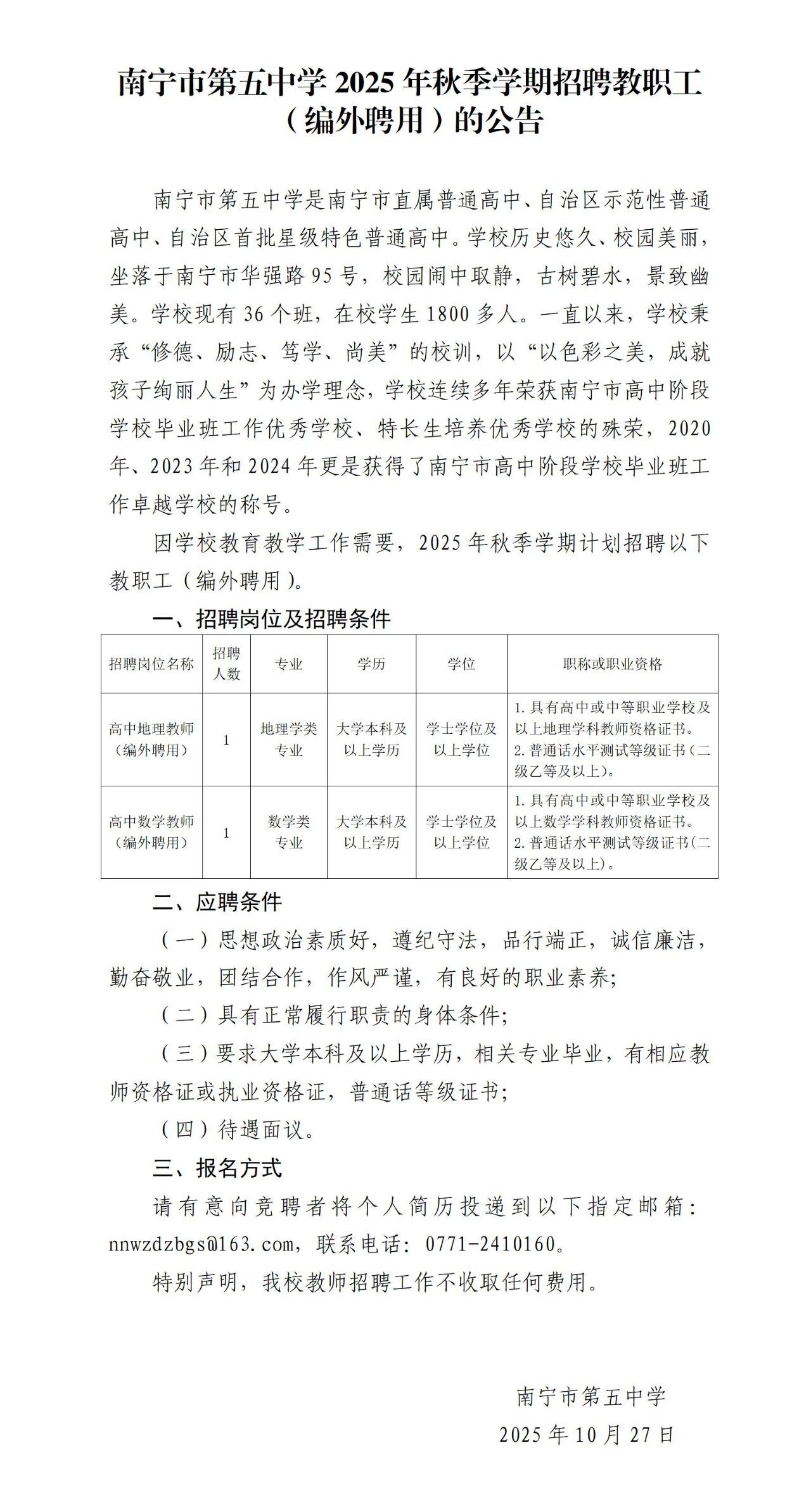 2025年南寧市第五中學秋季學期招聘教職工(編外聘用)的公告
