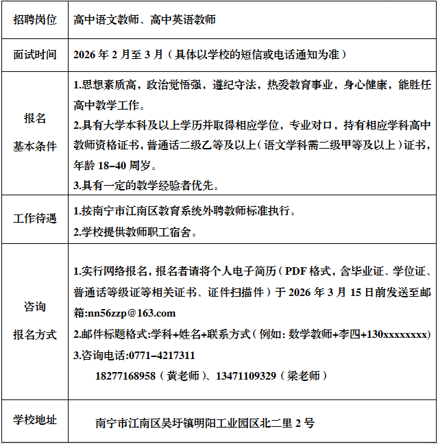 原文標(biāo)題:南寧市第五十六中學(xué)2026年春季學(xué)期編外教師招聘公告